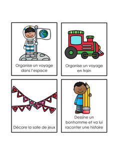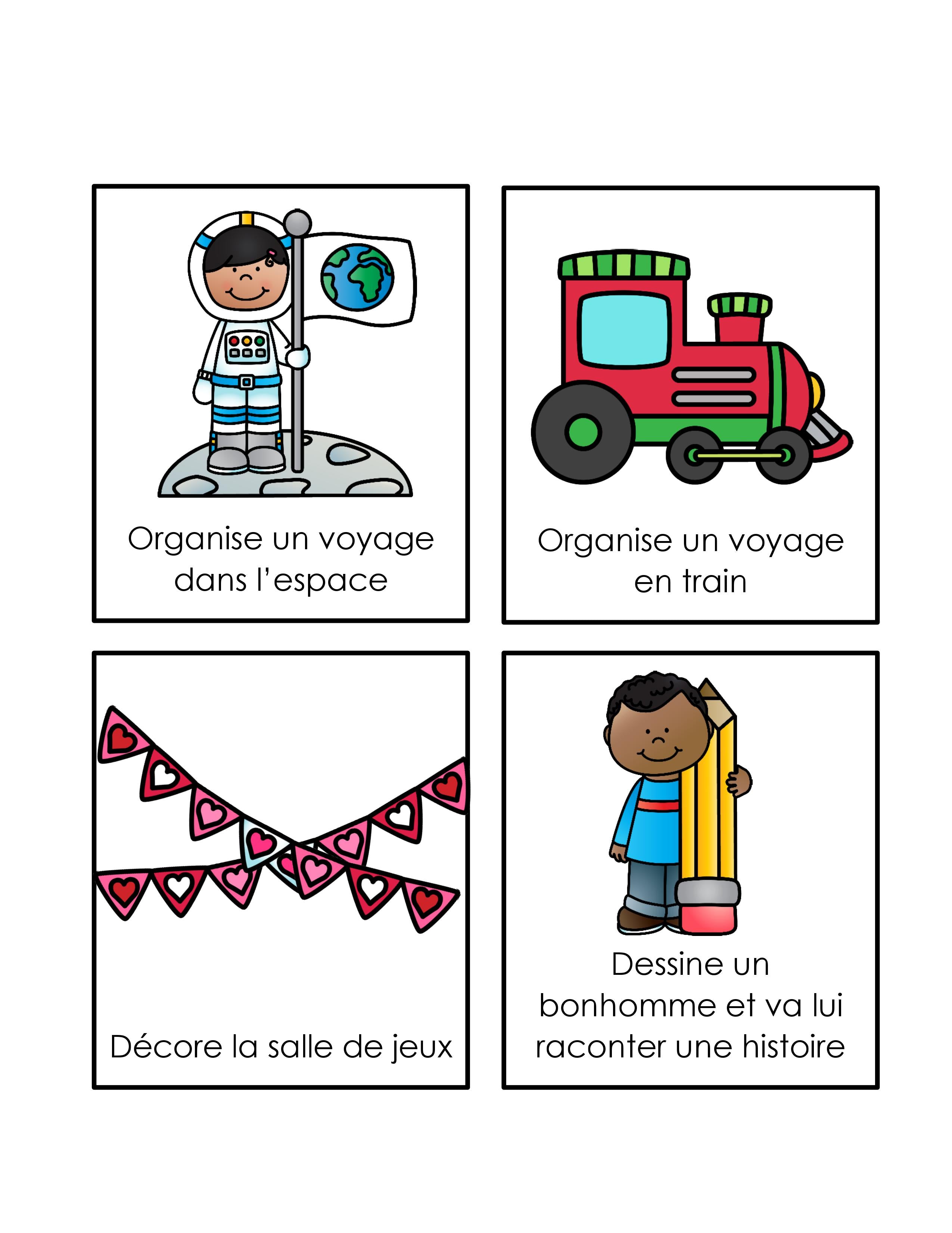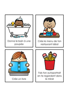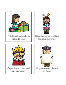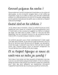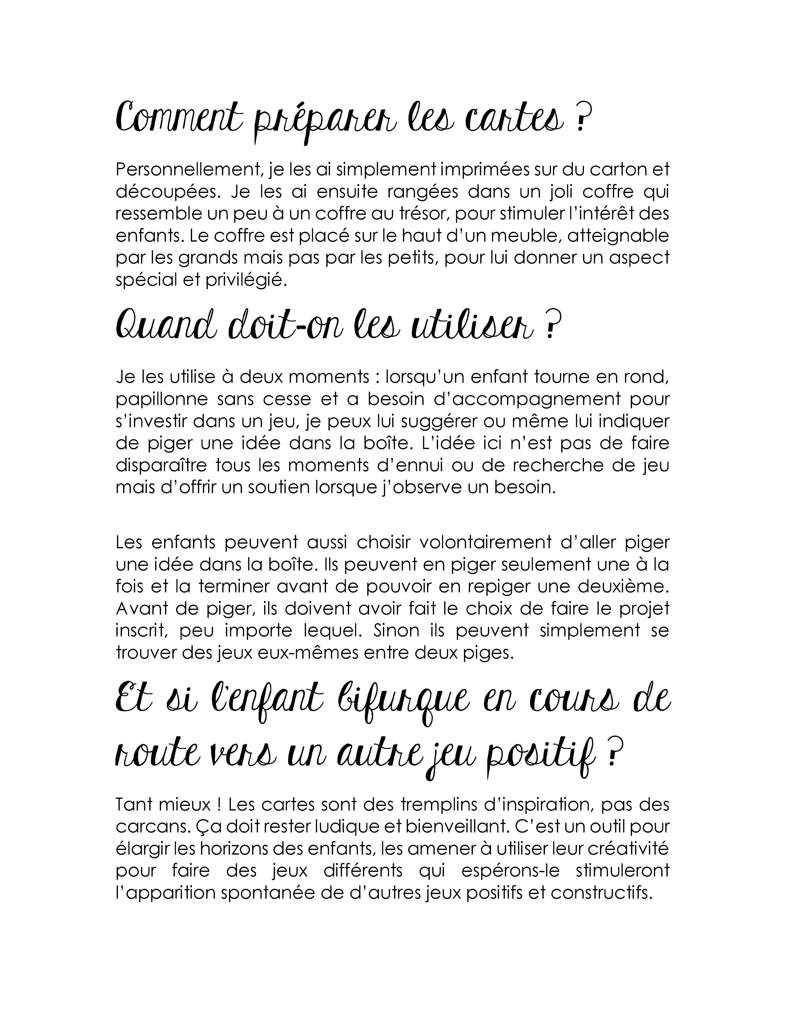 Ces cartes sont des tremplins d’inspiration. C’est un outil pour élargir les horizons des enfants, les amener à utiliser leur créativité pour faire des jeux différents qui espérons-le stimuleront l’apparition spontanée de d’autres jeux positifs et constructifs.
