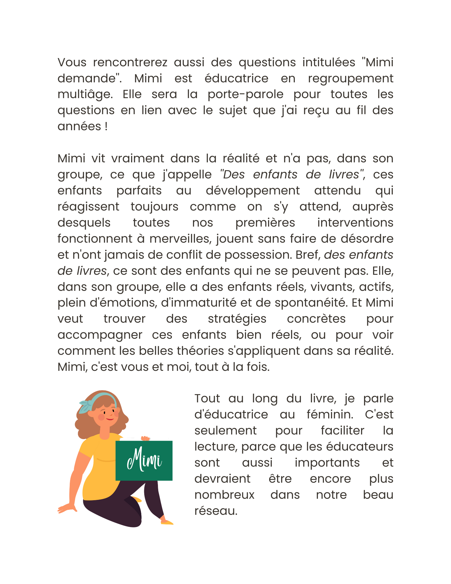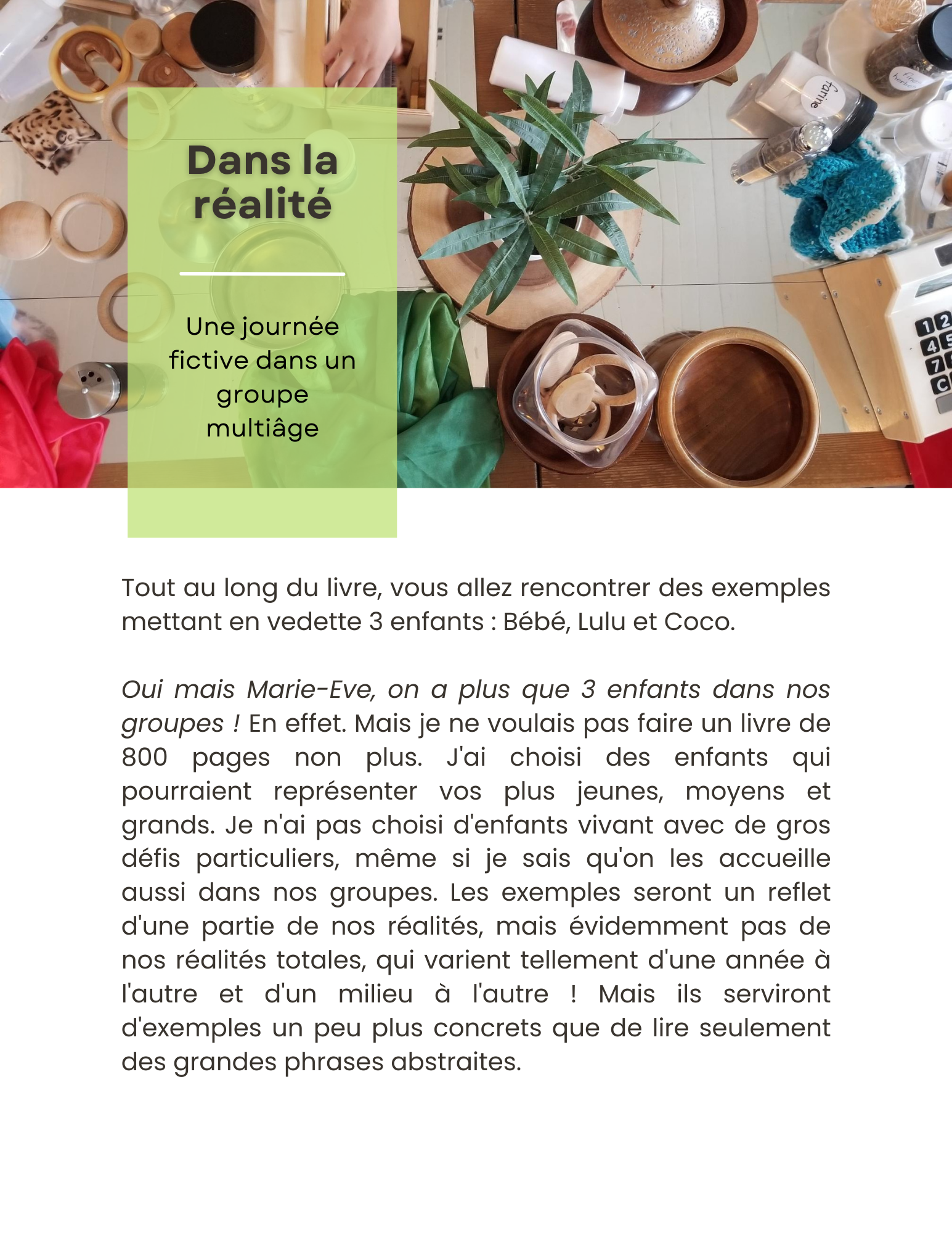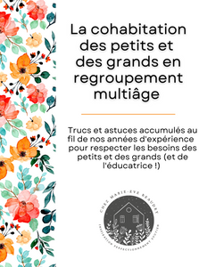 Voici 265 pages de trucs et conseils accumulés au fil des ans pour faire cohabiter les petits et les grands en regroupement multiâge. C'est un résumé de ma propre expérience avec plus de 20 ans auprès de mon groupe multiâge en milieu familial. C'est aussi, selon moi, un livre qui peut être utile pour un regroupement homogène, puisque chaque enfant est différent et demande que l'éducatrice ou l'éducateurs'adapte à ses forces et à ses défis.